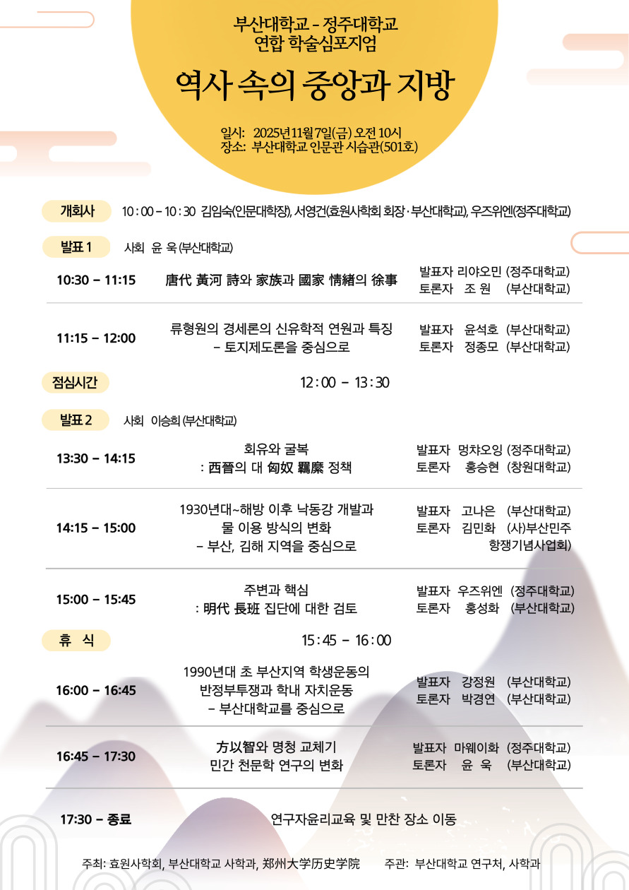 효원사학회가 공동으로 주최하는 2025 부산대학교-郑州大学 연합 학술심포지엄 개최를 안내드립니다.